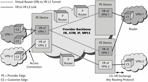 As shown in Figure 9.24, a VPN customer site is connected to the provider backbone by means of a connection between a customer edge devicewhich can be one or more hosts and/or routersand a virtual router. Customer edge devices are preconfigured to connect to one or more virtual routers. Multiple virtual routers may coexist on the same service provider edge device or provider edge. Customer edge devices can be attached to virtual routers over any type of access link (e.g., ATM, Frame Relay, Ethernet, PPP) or IP tunneling mechanisms (e.g., IPsec, L2TP, or GRE tunnels). Customer edge sites can be statically connected to the provider network via dedicated circuits or can use dialup links. Routing tables associated with each virtual router define the site-to-site reachability for each VPN. The internal backbone provider routers are not VPN aware and do not keep VPN state.
