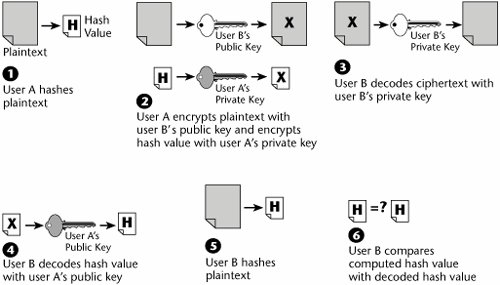 User A encrypts the plaintext with user B's public key and encrypts the hash value with user A's private key. |