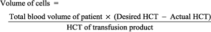 "Allowable Blood Loss": Often used to guide acute transfusion in the operating room. Losses less than allowable are usually managed with IV fluid replacement. Weight in kg x 0.08 = Total blood volume Total volume x 0.3 = Allowable blood loss (assumes normal Hbg) Example: A 70-kg adult Estimated allowable blood loss = 70 x 0.08 = 5.6L or (5600 mL) x 0.3 = 1680 mL Chronic Anemia: Common in certain chronic conditions, such as renal failure, rarely managed with blood transfusion; typically managed with pharmacologic therapy (eg, erythropoietin). However, transfusion is generally indicated if Hgb < 6 g/dL or in the face of symptoms due to low hemoglobin. RBC Transfusion Formula: As a guide, 1 unit of PRBC raises the HCT 3% (Hgb, 1 g/dL) in the average adult. To roughly determine the volume of whole blood or PRBC needed to raise the HCT to a known amount, use the following formula: