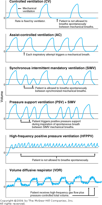 8 16 breaths/min) for adequate minute ventilation. For a spontaneously breathing patient, PS can be increased to achieve a target minute ventilation. - 3. Pressure support: After the patient's respiratory pattern is established on SIMV, add PS at an initial level of 5 10 cm water. Increase PS to the level at which the patient can achieve reasonable tidal volume and breathe at a comfortable rate (< 30 breaths/min). Depending on the overall stability and mental status of the patient, turn down the number of SIMV backup breaths so that the patient assumes more control of ventilation. PS rarely has to exceed 20 cm water.