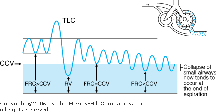 - 4. PEEP: With the addition of PEEP, the ventilator maintains positive airway pressure at the end of expiration even though net airflow is zero. PEEP increases alveolar ventilation by preventing small-airway collapse, thereby improving lung compliance and FRC. Increasing levels of PEEP are typically used in the care of hypoxemic patients who need FIO2 > 50%. With PEEP, FIO2 can be reduced and O2 toxicity limited. PEEP