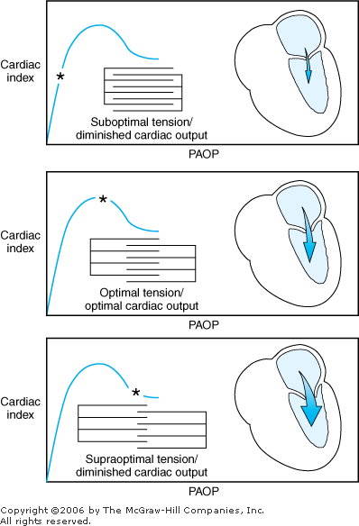 Cardiovascular Physiology Definitions Cardiac Output (Co): Volume of blood pumped by the heart each minute; approximately 3.5 5.5 L/min (adult). CO is standardized to patient size by calculation of the cardiac index (CI): CI = CO/BSA; normal CI 2.8 3.2 L/min/m2. CI < 2.5 L/min/m2 may require pharmacologic intervention if O2 delivery is inadequate. CO is the product of heart rate and stroke volume. Stroke volume is a function of preload, afterload, and contractility. Preload: Initial length of myocardial muscle fibers is proportional to left ventricular end-diastolic volume (LVEDV), which is governed by the volume of blood remaining in the left ventricle after systole. As LVEDV increases, the stretch on myocardial muscle fibers increases. Furthermore (Figure 20 2, top), as LVEDV increases (ie, stretch), the energy of contraction increases proportionally until an optimal tension develops (Starling law; Figure 20 2, middle). However, when the myocardial muscle fiber is overstretched, contractile strength decreases. |  | Representation of Starling law. PAOP = pulmonary artery occlusion pressure. |