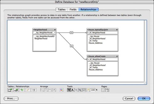 Consider the Relationships Graph shown in Figure 16.5, in which a neighborhood is related to many houses. The second of the two relationships is set to allow for the creation of related records. Note that we have created two foreign IDs in the related table occurrences and that the two relationships are different.