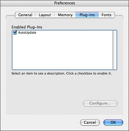 As with all plug-ins, the AutoUpdate plug-in should be placed in the Extensions folder within the FileMaker Pro application directory. To confirm that the plug-in is enabled, go to the Plug-ins tab of the Preferences dialog, which is shown in Figure 25.15.