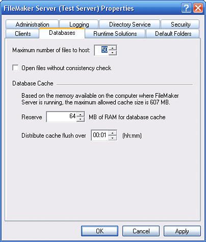 The SAT has a number of settings that control the resources that FileMaker Server sets aside for certain tasks. On the Clients tab of the SAT, you can specify the maximum number of FileMaker Pro and web clients that can be connected at one time, and on the Databases tab you can control the maximum number of files that FileMaker Server will try to open. (The Clients tab was shown previously in Figure 25.2. The Databases tab is shown in Figure 25.5.) All these numbers have a hard upper limit: 250 for simultaneous FileMaker Pro or ODBC/JDBC users, 100 for simultaneous web connections, and 125 for the maximum number of open files. If you know that your loads will be lower than those figures, though, you can lower the numbers. If youll never need to have more than 50 files open, or more than 25 users, you can set these thresholds lower. Doing so frees up resources, such as RAM, that FileMaker Server would otherwise need to keep in reserve for the possible higher loads. As a general rule, you should set these three numbers as low as you can.
