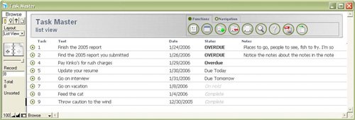 Just as you can apply text formatting functions by using a script or through calculation fields, your database can automatically change text formatting on entry. Both Chapter 3, "Defining and Working with Fields," and Chapter 8, "Getting Started with Calculations," have covered this functionality. This auto-entry capability to reformat data on entry enables you to capture information on the way in and impart additional meaning through making it bold, red, and so on. Note that you will be changing the data in question; more than simply a display technique, this modifies the data itself. One application of this technique could be changing your text to red if some validation condition fails. Another example is to color-code or to apply bold and italic styles to a status field. For example, note in the example shown in Figure 13.17 that the status of various to-do items is immediately apparent.