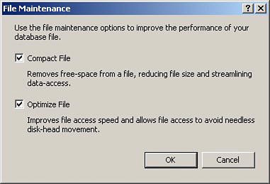 The File Maintenance feature is available only in FileMaker Pro 8 Advanced (formerly FileMaker Developer). File maintenance can be performed only on files that are open locally. It can't be performed on files that are hosted. To invoke it, choose Tools, File Maintenance. You'll see a dialog like the one in Figure 17.13, which allows you to choose to compact the file, optimize the file, or both. We recommend you execute both of these steps when performing file maintenance.