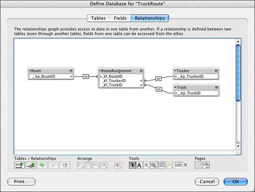 It might also be useful to you to organize your table occurrences into logical groups of some kind within the Relationships Graph. Let's say you're working on a trucking module with four table occurrences, and you also have a file reference to an external user-management module and you've used that to bring a number of user-oriented table occurrences into the Graph. FileMaker enables you to color-code table occurrences in the Graph, so it's possible to give each group of table occurrences its own color.