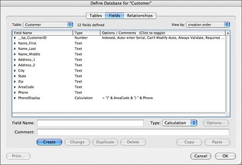 You also need to decide which fields in the target are to receive data, and from which source columns they'll receive data. Figure 19.2 shows the field structure for a FileMaker table designed to hold customer information. It consists mostly of text fields, with the exception of the PhoneDisplay field, which is meant to create a formatted display from the AreaCode and Phone fields.