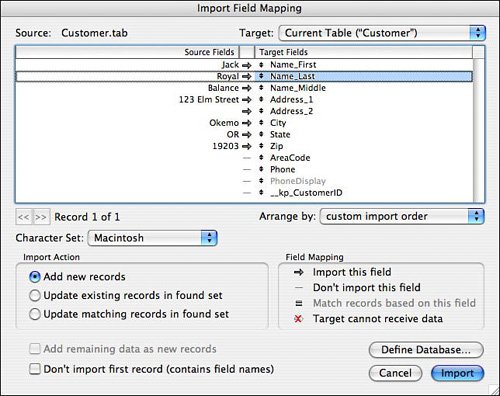 All these goals are easily accomplished with FileMaker's import options. Figure 19.6 shows the necessary settings in the Import Field Mapping dialog.