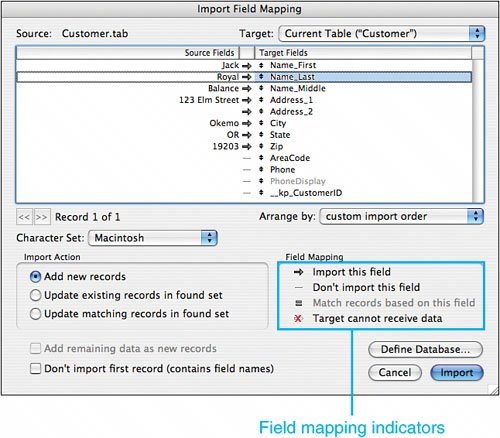 Figure 19.4. FileMaker's Import Field Mapping indicators.