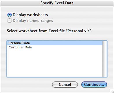 FileMaker Pro has some special capabilities for importing data from Microsoft Excel documents. FileMaker is aware of multiple worksheets within an Excel document, and is also aware of any named ranges (a group of cells that's been given a specific name). When you select an Excel file for import, if it contains multiple worksheets or named ranges, FileMaker prompts you to select either a worksheet or a named range as the source for the data, as shown in Figure 19.8.