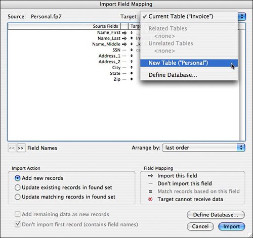 Importing from a FileMaker file can be particularly convenient in that it allows you to use the Matching Field Names option for lining up the source and target fields. Developers will often choose to open a source file within FileMaker, creating a new FileMaker file based on the originating document, and then use that new FileMaker file for importing, data cleanup, and so on.