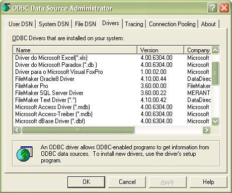 To create a DSN to access a particular ODBC-based data source, you need to have a driver for that particular data source installed on the computer you're working from. Figure 19.18 shows the Mac and Figure 19.19 shows the Windows ODBC tools with a list of available drivers. Windows systems tend to have a great many ODBC drivers installed by default. Mac OS X, by contrast, doesn't install any ODBC drivers by default.
