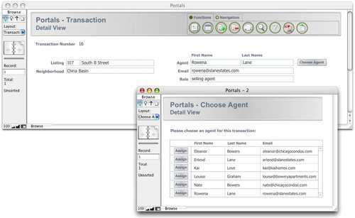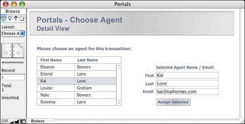Selection portals offer an alternative to the standard approach of using value lists to choose foreign key values: The only way two records in an equijoin become related is if they share a like value in match key fields. If you want, for example, to relate a real estate agent to a listing record, you can either manually enter the key for an agent into an AgentID field for the listing record, or assist data entry by providing a pop-up list or menu of options.