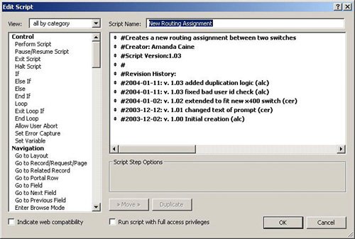 Finally, FileMaker enables you to add comments to your scripts. Some developers have elaborate script commenting disciplines. They may create an entire header of comments with space for the names of everyone who's worked on it, the creation date, and even a full modification history. Figure 17.2 shows an example of such a commenting style.