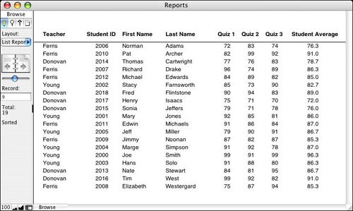 Earlier in the chapter, we developed a Student Quiz Scores list report. Now that example will be extended into a subsummary report. Assume that each of the students has been assigned to a teacher (Donovan, Ferris, or Young); the present goal is to produce a subsummary report of the scores by teacher. Figure 10.7 shows the data from which the report will be generated (as a simple list).