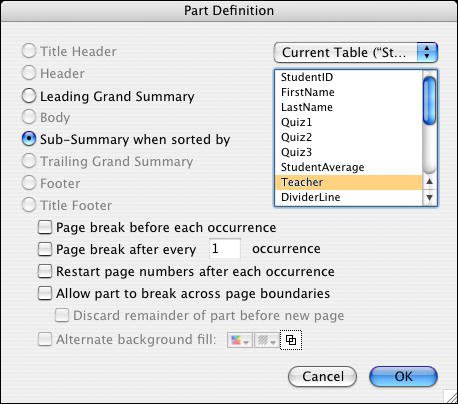 When you add a subsummary part to a layout, you must specify what break field should be represented by that part. In this example, shown in Figure 10.8, the Teacher field has been selected as the break field.