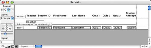 You will typically place the break field itself in the subsummary part, but this isn't required. Any other fields you place in the subsummary part are generally summary fields; if they are not, they will display data from the first record in the applicable set. Figure 10.9 shows what the new Quiz Scores by Teacher report looks like in Layout mode; the Teacher field and a horizontal line have been placed in the subsummary part. Notice also that the Teacher field has been removed from the body part because it would be redundant.