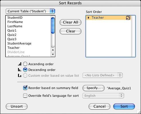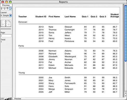 When you create a subsummary report, the groups are ordered according to how you have sorted the break field. For example, in the Quiz Scores by Teacher reports, the groups are ordered as Donovan, Ferris, Young. A descending sort would have resulted in the groups being ordered as Young, Ferris, Donovan.