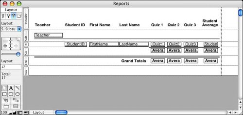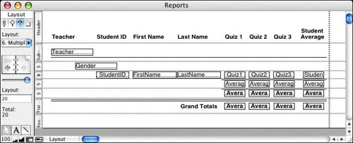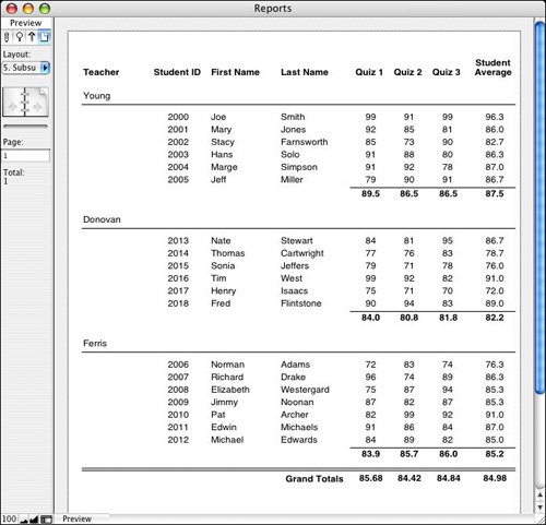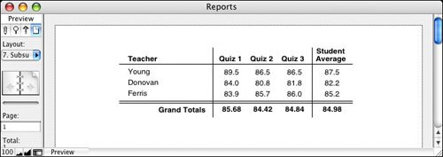 If another subsummary report were built that summarized on, say, students' genders or favorite pizza toppings, the same summary fields could be used in that report. Summary fields are thus quite versatile and powerful. You'll find that after you've developed one subsummary report it's quite easy to duplicate the layout and change the break field specified for the summary part(s), thereby creating an entirely new and different report. For example, the layouts needed to generate Quiz Scores by Teacher, Quiz Scores by Gender, and Quiz Scores by Favorite Pizza Topping would be nearly identical to each other; you wouldn't need to modify the definitions of the summary fields in any way.