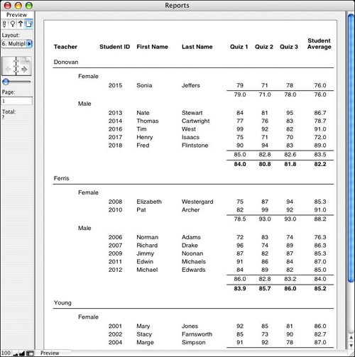 To properly generate this report, you would need to make sure that your found set was sorted first by teacher and then by gender. The finished report is shown in Figure 10.14. If it were sorted by only one of those fields, you would end up with a single-criterion subsummary report; the other part would not be displayed on the report. This means that a single layout can generate several different reports, if just the sort criterion is changed.