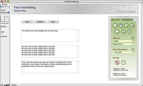 In FileMaker Pro 8, nine text formatting functions obviate the need for many of these old workaround options. They are each discussed in detail in our FileMaker 8 Functions and Scripts Desk Reference, but here we demonstrate some examples of how and why you might use these functions.