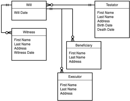 Similar logic applies to the Executor, Witness, and Beneficiary entities. All are people, so you'd presumably want their names and probably addresses as well. For witnesses, you'd also like to know the date on which they witnessed the will.