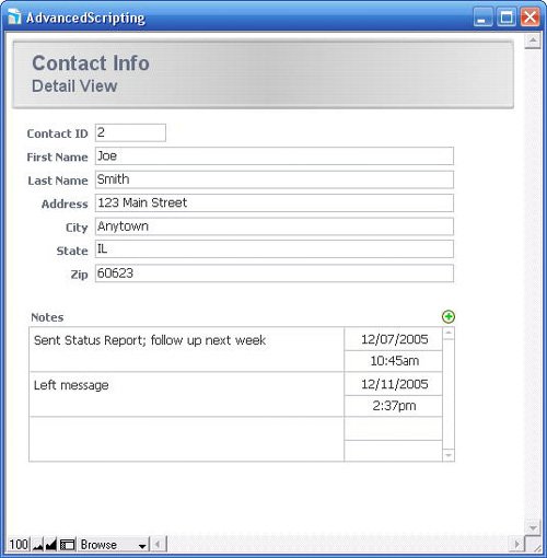 There are many ways you could script the actual addition of the note record. This example navigates to a layout based on the ContactNote table. Because the user entered the new note into a global field, after the new record is created, the ContactNotes::Note field can be directly set to the value of the gNote field. However, the ContactNotes::ContactID field, which is a foreign key relating back to the Contact table, needs to be set to the ContactID of whatever the active record was at the beginning of the routine. It could simply be placed in a field with global storage, but instead, we've elected to have the Submit button pass the ContactID as a script parameter to the Submit Note script.
