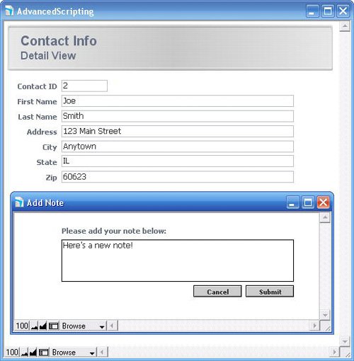 On the Add Note layout itself, both the Cancel and the Submit buttons are specified to Resume the current script. The Cancel script simply closes the current window. The Submit button, which is defined to pass the current record's ContactID as a script parameter, runs the following script:
