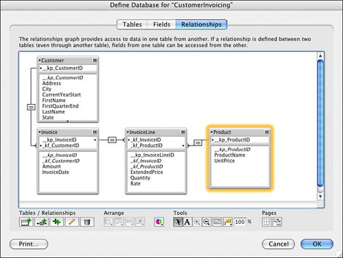 You might want to do a number of things in this system that would have been slightly cumbersome in versions of FileMaker prior to FileMaker 7. Suppose, for example, that you'd like a portal on a customer layout showing all the products that customer had ever purchased. Previously, you might have used a somewhat complicated technique involving global fields and the Copy All Records script step to "hop" from a customer record to the customer's related invoices, and then again from the invoices to their related line items, and finally from the line items over to products. Scripting this process was relatively slow, and the technique was not guaranteed to work for large data sets.
