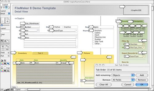 Anyone with the ability to modify a layout can change its tab order; do so by selecting Layouts, Set Tab Order. The Set Tab Order dialog has changed in FileMaker 8. It is no longer modal and allows developers to click on both fields (the arrows to the left of objects) and objects themselves (the arrows to the right of objects) to manually edit the tab order for a given layout. You can also opt to remove items by pressing the Delete or Backspace key. |