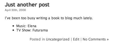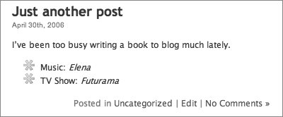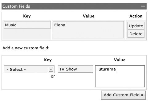 | Custom fields, available only for WordPress server installations, give you some interesting possibilities for working with your posts. You might use one of the many plugins that require you to edit custom fields, such as those listed at codex.wordpress.org/Plugins/Meta. Or perhaps you sometimes like to add some extra information to your post, such as your mood, what music you're listening to, or a list of related links. You add a key and then give the key a value. For example, if I wanted to add a line to my post telling my visitors what book I'm currently reading then my key may be: "Currently reading". The value would vary from post to post, and would be the title of whatever book it is I'm reading at that time. To use custom fields you must both add the field key and value to your post and edit one or more theme files. We show you in detail how to edit theme files in Chapter 6. If you add any custom fields WordPress treats them as an unordered list. It wraps the items in list tags when it generates the page, as you can see in this example: <ul class='post-meta'> <li><span class='post-meta- key'>Music:</span> Elena</li> <li><span class='post-meta-key'>TV Show:</span> Futurama</li> </ul> This WordPress-generated coding creates what you see in Figure 73. The ul is given a class of post-meta, while the key is wrapped in a span of class post-meta-key. The key and value are both contained within an li tag. You can set up rules within the CSS file to control the appearance of the various items. If you have more than one custom field attached to a post, they are displayed sorted by alphabetical order of the Key field. You can add custom fields through the Write Post or Write Page administration panel. If you use a stand-alone blogging tool, such as those we wrote about in Chapter 9, you may find you are unable to add any custom fields by that means. To add a custom field to a post 1. | Log in to the Dashboard.