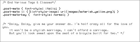 .post-meta { font-style: italic; } .post-meta li { list-style-image: url(images/asterisk_yellow.png); } .post-meta-key { font-style: normal; } | 4. | Save the style sheet to the server. Any custom fields will be styled according to the new rules.