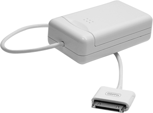 Griffin TuneJuice Battery Backup Here's another external battery solution for drained iPods. The TuneJuice connects via a short cable to your iPod's dock connector, and provides up to 8 hours of additional play time. It works off a 9-volt battery, so when your 8 hours are up, just plug in a new battery to keep on playing! |  Model: TuneJuice Manufacturer: Griffin Technology (www.griffintechnology.com) Price: $19.99 |