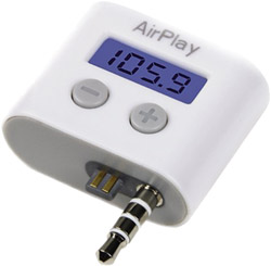 XtremeMac AirPlay FM Transmitter Here's a neat little FM transmitter that works across the full FM frequency band, with no need to install special software; just press the up or down buttons to scan through all available frequencies. The AirPlay is powered by your iPod, no batteries necessary, and lets you play iPod music through any FM radio. |  Model: AirPlay Manufacturer: XtremeMac (www.xtrememac.com) Price: $39.95 |