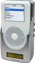 DLO TransPod FM Here's another iPod FM transmitter, this time built into a docking station and power adapter. Just plug the TransPod FM into your car's cigarette lighter, insert your iPod into the dock, dial in an open FM frequency on the digital tuner, and you're all set for in-car listening. |  Model: DLO Transpod FM Manufacturer: Netalog (www.everythingipod.com) Price: $99.99 |