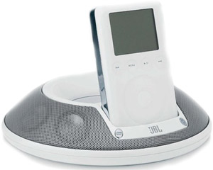 JBL OnStage Speaker System JBL's OnStage is an AC-powered speaker system just for iPods. Insert your iPod into the center cradle, and you get room-filling sound from the four built-in drivers. Even better, it looks kind of like a flying saucer! |  Model: OnStage Manufacturer: JBL (www.jbl.com) Price: $159.95 |
