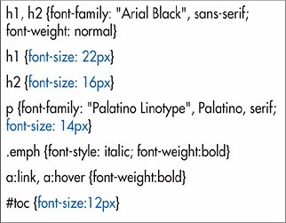 | There are two basic ways to set the font size for the text in your Web page. You can mandate that a specific size be used or you can have the size depend on the element's parent. Figure 10.14. Here I use pixel values to have control over the initial size of the text (which I've decreased in size throughout, compared with most browsers' defaults).  To mandate a specific font size: 1. | Type font-size:.