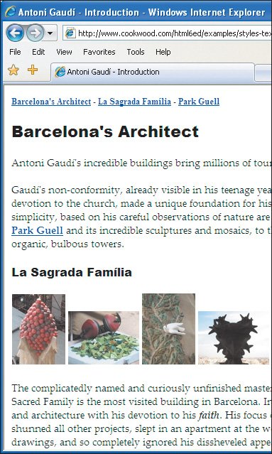 | Figure 10.15. The sizes I've specified are displayed in the browser. Internet Explorer will use these sizes even if the visitor chooses a different size with the Text Size command.  Tips See page 124 for details about units. There shouldn't be any spaces between the number and the unit. The average pixel is about 1/80th of an inch high (1/32 cm), though it depends on the screen resolution. Imagine a 17" monitor, whose screen is roughly 12.5" wide, with a resolution of 1024 x 768. At that resolution, text at 16 pixels would be about 1/5 of an inch high (about 1/2 cm). If you set the font size with pixels, visitors using Internet Explorer (up to and including version 7) will not be able to make the text bigger or smaller with the Text Size option. (Zoom still works.) Only use points, cm, mm, or picas in style sheets that format printed output (see page 209). Different browsers interpret the keywords in different ways. Explorer 5.x uses small as its base size while IE 6, Opera, and Netscape use medium. The font-size property is inherited. To set a size that depends on the parent element's size: 1. | Type font-size:.