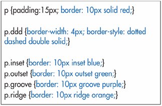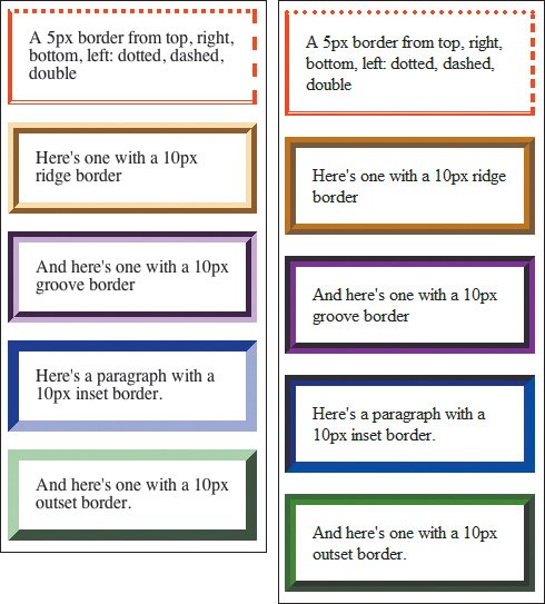 | Figure 11.46. The footer has a top border that is the same color but that is dotted instead of dashed.  Tips Borders are not inherited. The individual border properties (border-width, border-style, and border-color) can have from one to four values. If you use one value, it is applied to all four sides. If you use two, the first is used for the top and bottom, and the second for the right and left. If you use three, the first is used for the top, the second for the right and left, and the third is used for the bottom. And if you use four, they are applied to the top, right, bottom, and left, in clockwise order. Figure 11.47. In this mini-example, I set the padding and default border for each paragraph. Then for the first paragraph, I set the border width for all four sides, and then the style for each side. For the four remaining paragraphs, it was easier to repeat the 10px then to separate the style and color into two separate properties.  You must define at least the style for a border to display. If there's no style, there will be no border. The default is none. If you use a shortcut, like border or border-left (etc.), the properties you don't give values for are set to their defaults. So border: 1px black means border: 1 px black none, which means you won't get a border (even if you specified a style earlier with border-style). The default color is the value of the element's color property (see page 160). The width can also be expressed in generic terms: thin, medium, and thick. The default is medium. IE (up to and including version 7) cannot display very dark two-tone border styles like groove, ridge, outset, and inset. They come out solid.18 The border property can be used for tables and their cells. For more details, consult Adding a Border on page 230. Frankly, I think someone went a bit over the top in thinking up different ways to set the border properties. Figure 11.48. Firefox for Macintosh is shown on the left, IE 7 for Windows is on the right. The styles are very similarly displayed, but not exactly the same. Note, for example, how IE's dots are actually round and how Firefox's shading is lighter and more pronounced.  |