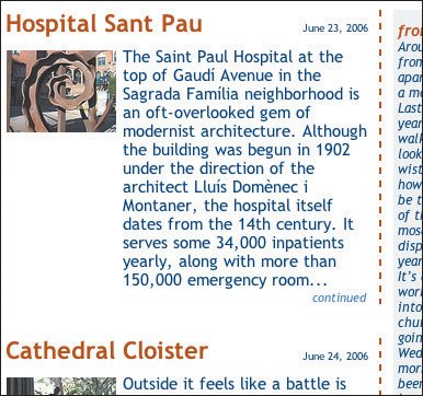 | You can create a border around an element and then set its thickness, style, and color. If you've specified any padding (see page 176) the border encloses both the padding and the contents of the element. To define the border-style: Type border-style: type, where type is none, dotted, dashed, solid, double, groove, ridge, inset, or outset. Figure 11.44. When you make a link out of an img element, the image is displayed with a blue border by default in most browsers. In this example, it's easier to remove the border from the img element than from a elements, though we could do that, too.  To set the width of the border: Type border-width: n, where n is the desired width, including abbreviated units (for example, 4px). To set the color of the border: Type border-color: color, where color is a color name or rgb color (see page 126 and the inside back cover). Figure 11.45. Notice that since a right border is applied to the entry div and not the main div, it stops and starts for each entry. Also, now that the photos don't have that annoying default border, there is enough space between them and the text.  To set one or more border properties at once with a shortcut: 1. | Type border.