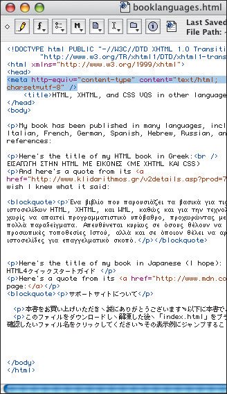 | Figure 21.6. In the head section of your Web page, create a meta tag that describes the encoding you used to save the file.  Tips Which encoding should you choose? My first choice would be UTF-8. It's more flexible than regional encodings, which are my second choice. The encoding you declare must match the encoding with which your page was saved. Otherwise, characters that differ between the encodings will display incorrectly. If you don't explicitly choose an encoding when saving your files, your text editor probably uses the default encoding for your system. You must still declare that encoding using the meta tag as described above. On Windows in the U.S. and Western Europe, the default encoding is windows-1252. On Macintosh in the U.S. and Western Europe, it's x-mac-roman. If you don't specify your page's encoding, the browser (and search engines) will guess, based on the visitor's preferences, information from the server (see next tip), the charset attribute (see last tip), or by examining the document. You have a better chance of the browser getting it right if you just make its life easy and tell it. Apache server users can add a line to their .htaccess file to declare the encoding of all files with a particular extension. The line should look like AddType 'text/html;charset=code' .html, where code is the character encoding. The .htaccess file overrides what you set with the meta tag. If you're having trouble, it may be that the server administrator has already adjusted the .htaccess file. For more details, see http://www.w3.org/International/questions/qa-htaccess-charset (including both dashes). To write a page in a different language from that of your operating system, you may also need keyboard layouts (or perhaps an IME, input method editor) that let you input the characters, and a text editor that supports the desired languages and that can save the page in the proper encoding. If the text editor can at least save the file in Unicode, you can use IE for Windows to convert the file to any of the encodings that it recognizes (by opening the file and choosing File > Save As). IE 6 for Windows, when browsing a page with an encoding it's not set up for, will automatically ask the visitor if they'd like to download the appropriate resources. This is an important reason to include the proper encoding. You can theoretically add the charset attribute to a link or script to describe the associated files' encodings. However, this feature is not yet widely supported. Figure 21.7. When you tell the browser what encoding to expect, and as long as it supports that encoding and the visitor's system has an appropriate font, the characters display properly.  Figure 21.8. If you don't tell the browser what to expect, it makes an attempt, but often doesn't know how to display the characters properly.  |