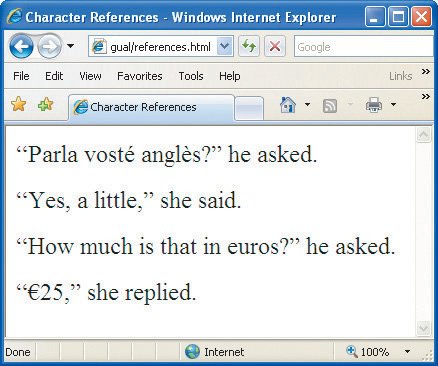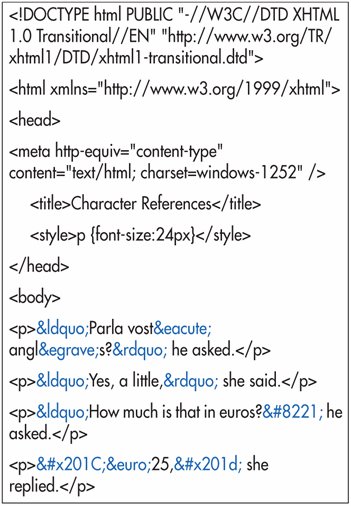 | Tips In general, you only need to use character references for characters that are not part of the document's character encoding. The principal exception to the first tip is the & symbol. In XHTML documents, when used as text (as in AT&T), you must use its character reference (&). The greater than, less than, and double quotation mark symbols also have special meaning in (X)HTML. You should use their character references>, <, and ", respectivelywhen not using them in the markup code itself. While using references for characters like é and £ is valid, using the proper encoding (e.g., utf-8) is much faster for large chunks of text. The most common default encodings, including windows-1252 and x-mac-roman lack several useful symbols. You can use character references to create these symbols without touching the default encoding. If you're using a hexadecimal or numeric reference, don't forget the # between the ampersand and the number. And if you're using a hexadecimal, don't forget the lowercase letter x, that indicates that the hexadecimal is coming. While there are hex and numeric references for every character in Unicode, there are named entity references for only 252 of them. They are case-sensitive. See Appendix D for a complete listing. Your visitors will only be able to view the characters for which they have adequate fonts installed. While you can specify a particular font (see page 152), it's not required; in its absence browsers should search the available fonts for one that includes the characters in question. You may also insert small quantities of special characters by using GIF images (see page 90). Figure 21.18. You can use any combination of named, numeric, or hexadecimal references in your document. It doesn't matter which encoding the document is in. Of course, it's better just to use an encoding like UTF-8 that supports the characters you need.  Figure 21.19. The characters display properly. Note that the visitor's browser must have an appropriate font for the characters.  |