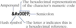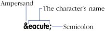 Figure 21.17. An entity reference, also known as a character entity reference or named reference, is made up of an ampersand, the character's name, and a semicolon. There are 252 named references that you can use in your (X)HTML pages. They are case-sensitive. This reference is also for an é.  | 3. | Finally, type ; (a semicolon).