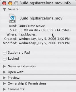 Figure 25.8. When you choose the item on the Desktop and then either choose Properties (on Windows) or Get Info (on a Mac, shown), you'll see the number of bytes in the enclosure (in this case, 36,699,714).  | To add an enclosure: 1. | Within the article's item (that you created on page 382), type <enclosure.