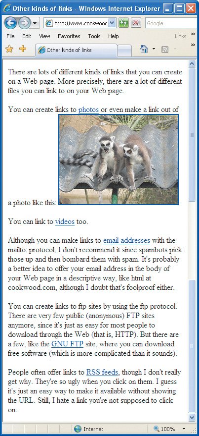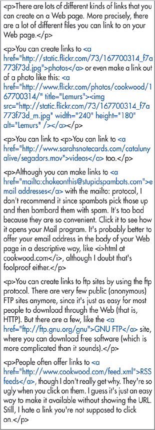 | Figure 6.15. You can create links to all different kinds of URLs.  Tips If you create a link to a file that a browser doesn't know how to handle (an Excel file, for example), the browser will either try to open a helper program to view the file or will try to download it to the visitor's hard disk. For more information, consult Of Plugins and Players on page 282. It's a good idea to compress files that you want visitors to download. This makes them faster to download and it also protects them from being corrupted as they go from one system to another. Allume Systems (www.allume.com) has some good compression tools for both Macs and Windows machines. Links to Usenet news groups (e.g., news:alt.soc.catalan), Telnet (e.g., telnet://lib.wuacc.edu), or even Gopher and WAIS used to be common. However, their dependence on external applications has meant their demise. Nowadays, most everything is handled directly in a browser with HTTP. For example, you can link to a Yahoo Group with a simple link: http://groups.yahoo.com/group/groupname/, where groupname is the official name of the group. Add message/number, where number is the message's id number, to link to a specific message. Of course, some Yahoo groups are private and so your visitors may be asked to log in before they reach their destination. Figure 6.16. No matter where a link goes, it looks pretty much the same in the browser (unless you wrap it around a photo). Notice that I've tried to create labels that flow with the body of the text, instead of a lot of "click me's". These are all real links. You can see where they lead by opening this page in your own browser: http://www.cookwood.com/html6ed/examples/links/newotherlinks.html  You can preface an FTP URL with name:password@ to access a private FTP site. Beware that browsers keep track of where you've been and the password you used to get there. If you want to create an FTP link to a particular directory on the FTP site (as opposed to an individual file), simply use ftp://ftp.site.com/directory. If you want to link to songs at the iTunes Music Store, you can use Apple's Link Maker to generate the URL (http://www.apple.com/itunes/ linkmaker/). If you are an affiliate (http://www.apple.com/itunes/affiliates/), Apple pays you a commission on songs people buy through your links. |