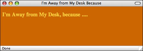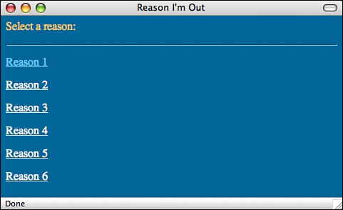 | Most commonly, framesets provide navigation bars that keep navigational elements in view as the user scrolls through the contents of the document. By far, the most common place to present the navigation bars is on the left side of the browser window. Each time the visitor clicks a link in the left navigation frame, the content in the main frame displays the selected page. The (very silly) frameset that you'll create in this exercise demonstrates this technique. Although it's not a really practical example, it's simple, fun, and demonstrates the very same techniques you would use for a navigation bar. When you design a web page that uses frames, you normally design the frameset before you go through all the trouble of designing the content that goes into it. That's because you'll want to know how big your frames are going to be before you start designing graphics and other page content to put into them. I'm doing things a little backward here, but for good reason. It may help you to better understand how things fit together if you see real content in the frames as you design the frameset. For this reason, I'll have you design the content first. The following content pages don't include any of the frameset tags discussed so far. There are eight pages in all, but I promise that I'll keep the code for these pages really brief. Ready? Tip When you lay out the basic structure of a frameset, you don't normally want to be bothered with details such as the actual contents of the frames. However, your frameset won't be displayed properly when it's loaded into a frames-compatible browser for testing unless you define <frame> tags that include valid documents. If you want to design a frameset before you create the content, you can create a small empty HTML document called dummy.html and use it for all your frame testing. The frameset that you'll create in Exercises 14.3 through 14.7 consists of three frames. The layout of the frameset will be as shown in Figure 14.11. The frameset page loads first and instructs the browser to divide the browser window into three frames. Next, it loads the three pages that appear in the top, left, and main frames. Finally, if a user browses to the frameset without a frames-compatible browser, an alternative page will appear. Figure 14.11. You'll create a frameset that consists of three frames: top, left, and main. The top frame always displays the same web pageaway.html. The choices.html page that appears in the frame on the left side contains a list of links to six different pages named reason1.html through reason6.html. Each of these six pages will load into the main frame on the bottom-right portion of the frameset. Start with the page displayed in the top frame. This page will always appear in the frameset. Here you can include any information you want to display permanently as visitors browse through your site. Real-world examples for the content of this frame include the name of your website, a site logo, a link to your email address, or other similar content. Type in the following code and save it to your hard drive as away.html: <html> <head> <title>I'm Away from My Desk Because</title> </head> <body bgcolor="#cc6600" text="#000000"> <h3>I'm Away from My Desk, because ... </h3> </body> </html> Figure 14.12 shows this page. Figure 14.12. The top frame in the frameset.  Next, you'll create the left frame in the frameset. On real websites, this is typically the frame used for text or image navigation links that take your visitors to several different key pages on your site. For example, a personal site might have a navigation bar that takes its visitors to a home page, a guest book, a links page, and other sections of interest. A corporate or business site could contain links for products, customer support, frequently asked questions, employment opportunities, and so on. The contents page in the following example works exactly the same way that a realworld navigation bar does. When the appropriate link is selected, it displays one of the six pages in the main frame of the frameset. The contents page contains links to six pages, reason1.html through reason6.html, which you'll create next. After you enter the following code into a new page, save it to your hard drive in the same directory as the first page and name it choice.html: Input <html> <head> <title>Reason I'm Out</title> </head> <body bgcolor="#006699" text="#ffcc66" link="#ffffff" vlink="#66ccff" alink="#ff6666"> <p>Select a reason:</p> <hr /> <p><a href="reason1.html">Reason 1</a></p> <p><a href="reason2.html">Reason 2</a></p> <p><a href="reason3.html">Reason 3</a></p> <p><a href="reason4.html">Reason 4</a></p> <p><a href="reason5.html">Reason 5</a></p> <p><a href="reason6.html">Reason 6</a></p> </body> </html> Your page should look as shown in Figure 14.13 when you open it in a browser. Figure 14.13. The left frame in the frameset.  Now you need to create the six pages that will appear in the main frame when the visitor selects one of the links in the contents frame. The main frame is designed to display pages that normally you would display in a full browser window. However, if you're going to display your pages in a frameset that has a left navigation bar, you'll have to account for the reduced size of the frame in your design. To keep the page examples relatively easy, I've given them all the same basic appearance. This means that the code for all of these pages is pretty much the same. The only items that change from page to page are the following: To create the first of the six pages that will appear in the main frame, type the following code into a new page and save it as reason1.html: Input <html> <head> <title>Reason 1 - Forgot My Lunch</title> </head> <body bgcolor="#ffffff"> <h2><img src="/books/2/631/1/html/2/uhoh.jpg" width="275" height="275" align="left">I forgot my lunch at home.</h2> </body> </html> Figure 14.14 shows what this page should look like in a browser. Output Figure 14.14. T