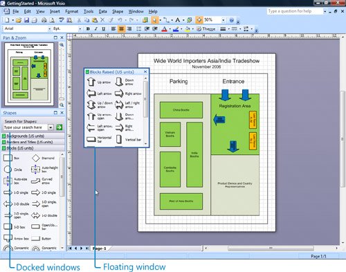 Double-click the 01_Start folder, and then double-click GettingStarted. Tip If the file extensions on your computer aren't hidden, the file name you will see in the Open dialog box is GettingStarting.vsd. The .vsd file extension stands for Visio drawing. Visio opens a diagram displaying the layout of a tradeshow and four stencils.