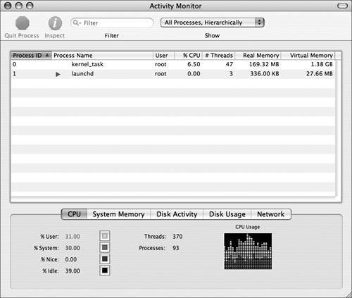| New in Mac OS X 10.4, the launchd process manages daemons, both for the system as a whole and for individual users. A daemon is a continuously running program, which exists for the sole purpose of managing service requests that the computer system expects to receive. The daemon forwards the requests to the appropriate processes. launchd manages daemons, both for the system as a whole and for individual users. During startup, launchd scans the LaunchDaemons and LaunchAgents folders in both /System/Library and /Library for plist files. Each plist file represents a process that launchd needs to manage. The contents of the plist file specify the location of the code that should be run and when the process should be launched. Unlike startup items, which are always launched during in the initial startup sequence, launchd items are intended to launch only when needed. This reduces the number of processes running, which, in turn, helps increase system performance and reduce initial startup time. Viewing the Process Hierarchy The launchd process is an essential part of Mac OS X 10.4, because it is initiated by the kernel task during startup, and launches a series of background processes. It is important to understand that there is a hierarchy of tasks in the core operating system, because it can be important in the event of a problem to identify parent tasks, such as launchd, that spawn several child tasks. In this exercise, you will learn how to use Activity Monitor to gather information about processes. 1. | Open Activity Monitor (/Applications/Utilities).